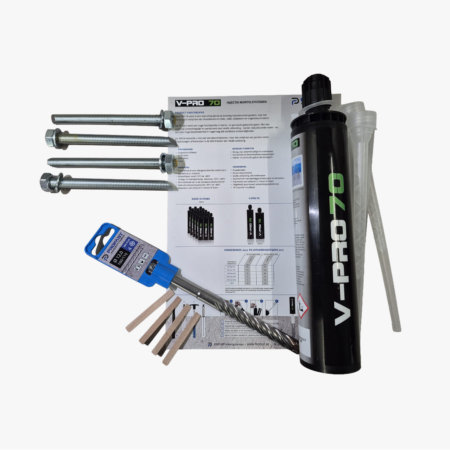 De set bevat een krachtige V-Pro 70 injectiemortel, die zorgt voor een extreem sterke chemische verankering in beton, natuursteen of metselwerk. In combinatie met de RVS draadstangen ontstaat een betrouwbare en langdurige bevestiging.