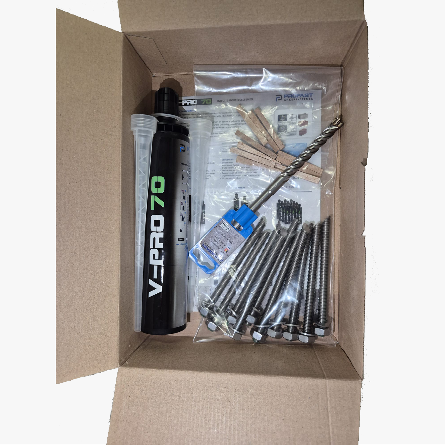 De set bevat V‑Pro 70 injectiemortel. Deze mortel hecht krachtig aan zowel beton als metselwerk en zorgt voor een stabiele basis. Omdat de mortel geen uitzetdruk veroorzaakt, kun je deze montageset ook gebruiken bij montagepunten dicht bij randen. In combinatie met zeefhulzen kun je de mortel bovendien toepassen in holle materialen. Hierdoor blijft de montage stevig en veilig, zelfs bij uitdagende ondergronden.