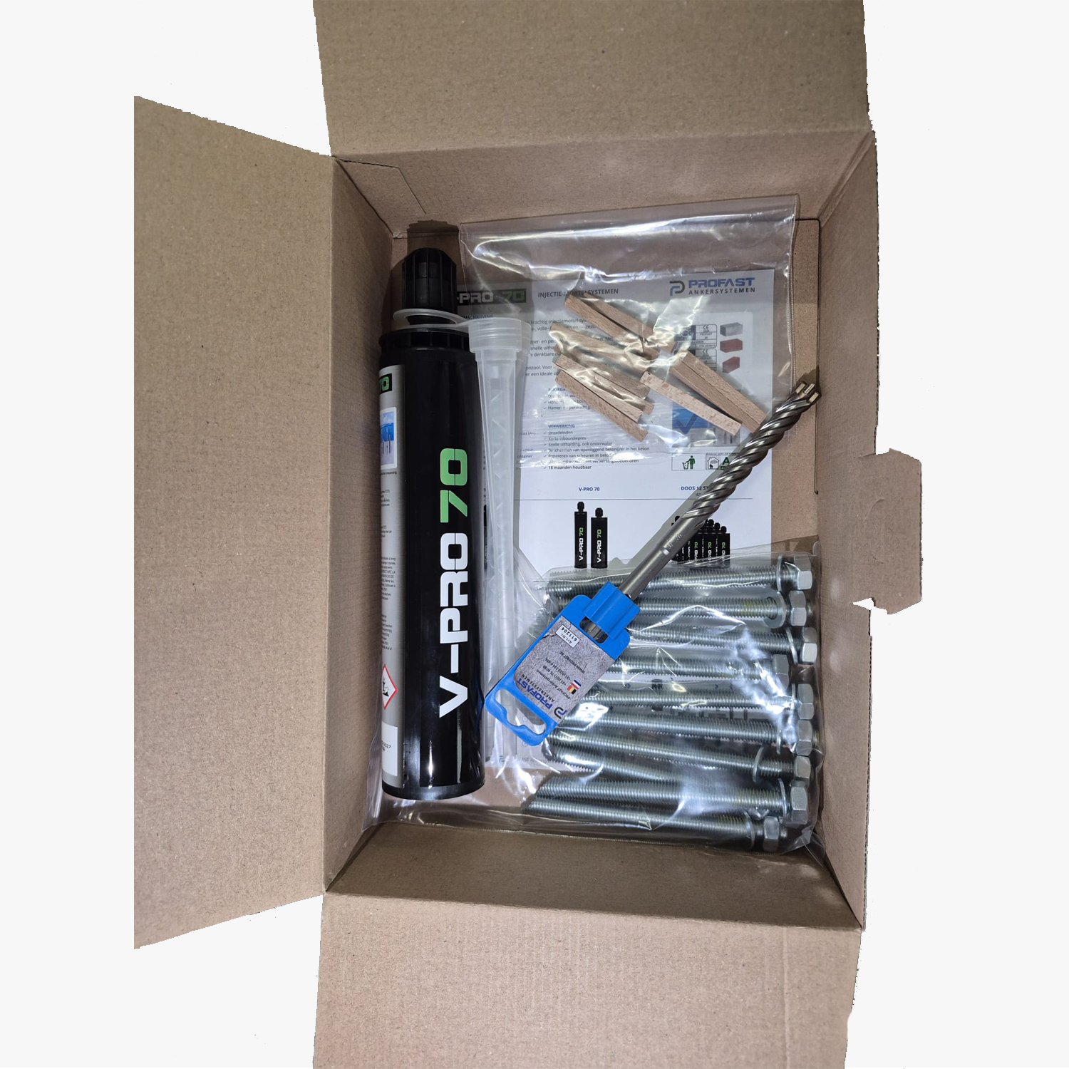 De set bevat V‑Pro 70 injectiemortel. Deze mortel hecht krachtig aan zowel beton als metselwerk en zorgt voor een stabiele basis. Omdat de mortel geen uitzetdruk veroorzaakt, kun je deze montageset ook gebruiken bij montagepunten dicht bij randen. In combinatie met zeefhulzen kun je de mortel bovendien toepassen in holle materialen. Hierdoor blijft de montage stevig en veilig, zelfs bij uitdagende ondergronden.